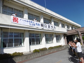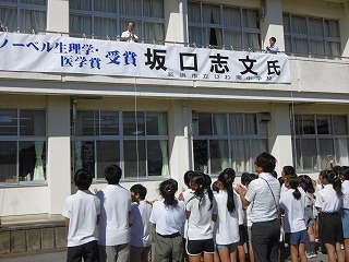 「坂口志文先生 ノーベル賞受賞 おめでとうございます!!」と、5,6年生がお祝いの言葉を言った後、2階ベランダから横断幕を垂らし初披露しました。
